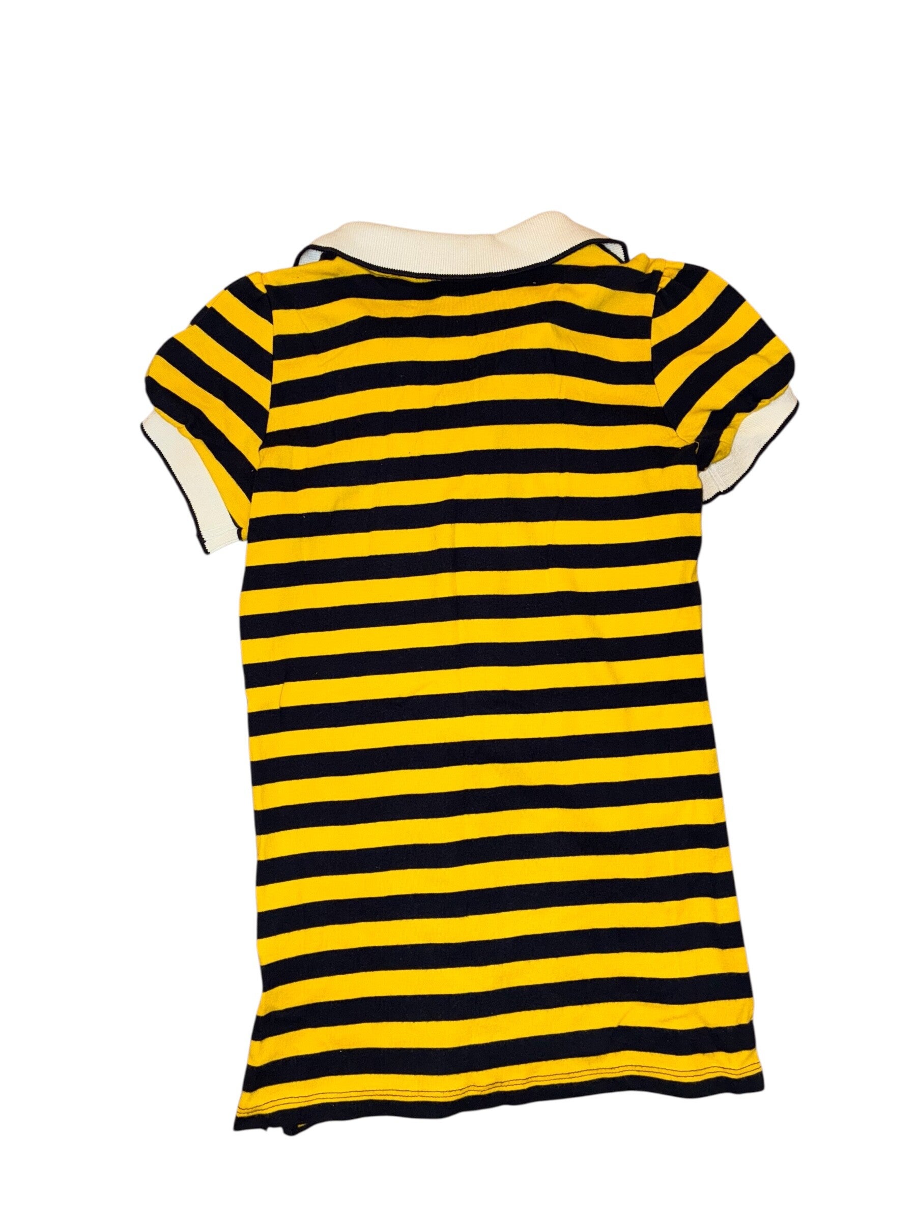 This Juicy Couture women’s top is a short-sleeve polo shirt with a bold black and yellow horizontal stripe pattern. It features a classic polo collar in contrasting cream/off-white, along with a button-front placket accented by branded buttons. The sleeves have a slightly ruched or puffed detail at the shoulders, giving it a feminine touch, and finished cuffs in matching off-white trim.